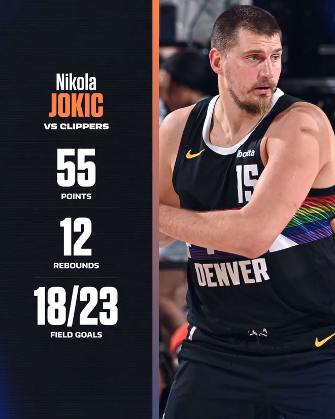 常规赛,掘金队以130-116击败快船队。本场比赛,约基奇打出了本赛季迄今为止最好的个人表现,全场33分钟23投18中,三分球6中5,罚球16中14得到55分12篮板6助攻,正负值+28。首节比赛,约基奇单节拿下25分。上半场结束,他拿下33分,追平职业生涯上半场得分新高。上半场结束,掘金仍以63-68落后5分。关键是在第三季度。掘金队将领先优势扩大到43-22,并永远领先。本节比赛约基奇也掌控了比赛。第一节他就得到19分、5个篮板和4次助攻。他的个人创造力得分高于快船队的全队得分。第三节结束时,约基奇已经拿下了52分,这五个分完全是快船队的缩写。不幸的是,差异是太好了,约基奇在第四节只打了不到三分钟,最终得到了55分。这是什么概念?赛后点评: 1、约基奇本场比赛的真实命中率高达91.5%。 55+2和55分是约基奇职业生涯第三高效得分。上赛季他场均得到61分10篮板10助攻,一场比赛得到56分16篮板8助攻。他是职业生涯中第四位超过50岁的人,比奥尼尔多了四位。约基奇职业生涯中曾三次年过55岁或以上,与唐斯并列历史中锋榜首。张伯伦以72次击球中的5分排名历史第二和第一。这是约基奇职业生涯第一次单场得分超过50分,并带领球队取得胜利。最近三场失利的每一场都比统计数据更令人兴奋。约基奇发现与祖巴茨和洛佩兹(对阵约基奇·阿莫)很容易对抗。全场比赛结束,祖巴茨和洛佩斯合计得到28分,几乎是约基奇一半的得分。至于约基奇,我只能叹息。确实,他仍然是第一现役球员。本赛季初期,约基奇的爆发力还比较低。他在前五场比赛中取得了四次三双。不过,他单场得分从未超过25分。然而,从第六场比赛开始,约基奇又回到了MVP模式。约基奇自11月以来的六场比赛表现: - 对阵国王,34分7篮板14助攻4抢断,22投14中 - 对阵热火,33分15篮板16助攻3抢断,18投12中 - 对阵勇士,26分9篮板9助攻,15投12中 - 对阵热火,26分9篮板9助攻,15投12中步行者,14投10中,32分14篮板14助攻;对阵国王,19投16中,3.5分15篮板7助攻2抢断;对阵快船,186场比赛23投55分,12篮板6助攻,场均35.8分12.0篮板场均11.0次助攻。重要的是,他 111 次投篮命中 88 次,成为投篮命中率最高的球员。参与度达79.3%。这种效率和数据水平是前所未有的。我不知道如何表达这一点。怪物,真正的怪物。约基奇本赛季到目前为止的数据是,在11场比赛中,场均得到28.8分、13.1个篮板、10.9次助攻和1.9次抢断。今天的比赛结束后,约基奇的得分直接从联盟第13位提升到了第6位。篮板球排名联盟第二,助攻排名联盟第一。而约基奇的效率一如既往,投篮命中率为68.4%,三分命中率为41.7%,罚球命中率为85.9%,投篮命中率为惊人的77.3%。 2022-23赛季,约基奇单赛季投篮成功率一度达到70.1%,但此后下降至65.0%。此后两年,每年该比例均为 66.3%。此后,似乎连约基奇都无法再打出23年无与伦比的效率。因此,他本赛季的表现确实非常出色。说到高水平数据,约基奇是仍然是爆炸性的。 - PER值现为36.8,打破了自己的记录,历史第一 - BPM值+19.2,也是赛季第一,历史第一(SGA +11.9,赛季第二)。而且,这两个数据都是本场比赛之前的数据。今天拿到55+12+6之后,他们还会走得更高,突破真正的高水平数据。而本场比赛之前,一如既往,约基奇在场上的影响如下:——约基奇在场时,掘金百回合领先126.7分,而对手落后对手18.9分——约基奇在场时,掘金百回合领先108.2分,落后对手0.2分。 11场比赛下来,约基奇的累计正负值达到了+168,这让他不仅排在球队第一,而且也排在联盟第一。请记住,过去当约基奇不在场时,掘金每100回合落后10分左右,但本赛季终于不同了。这些可能是约基奇最好的掘金时代。毫无疑问,约基奇目前的纯实力排名第一,但他想要继续提升自己的历史地位,还需要赢得总冠军。今年他有机会赢得职业生涯的第四个MVP和第二个总冠军。兄弟们,这可能是下一个历史前十。让我们一起见证吧。